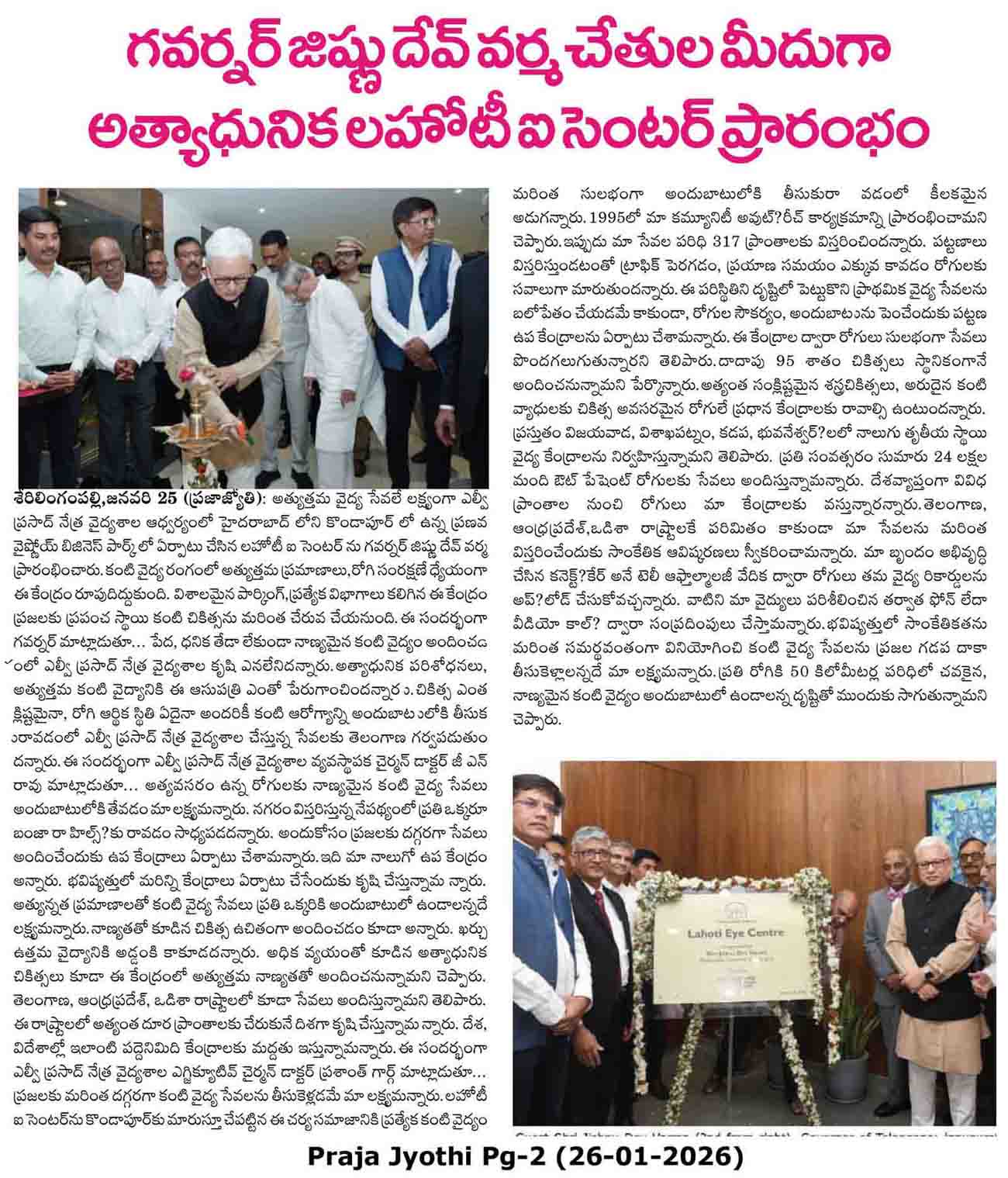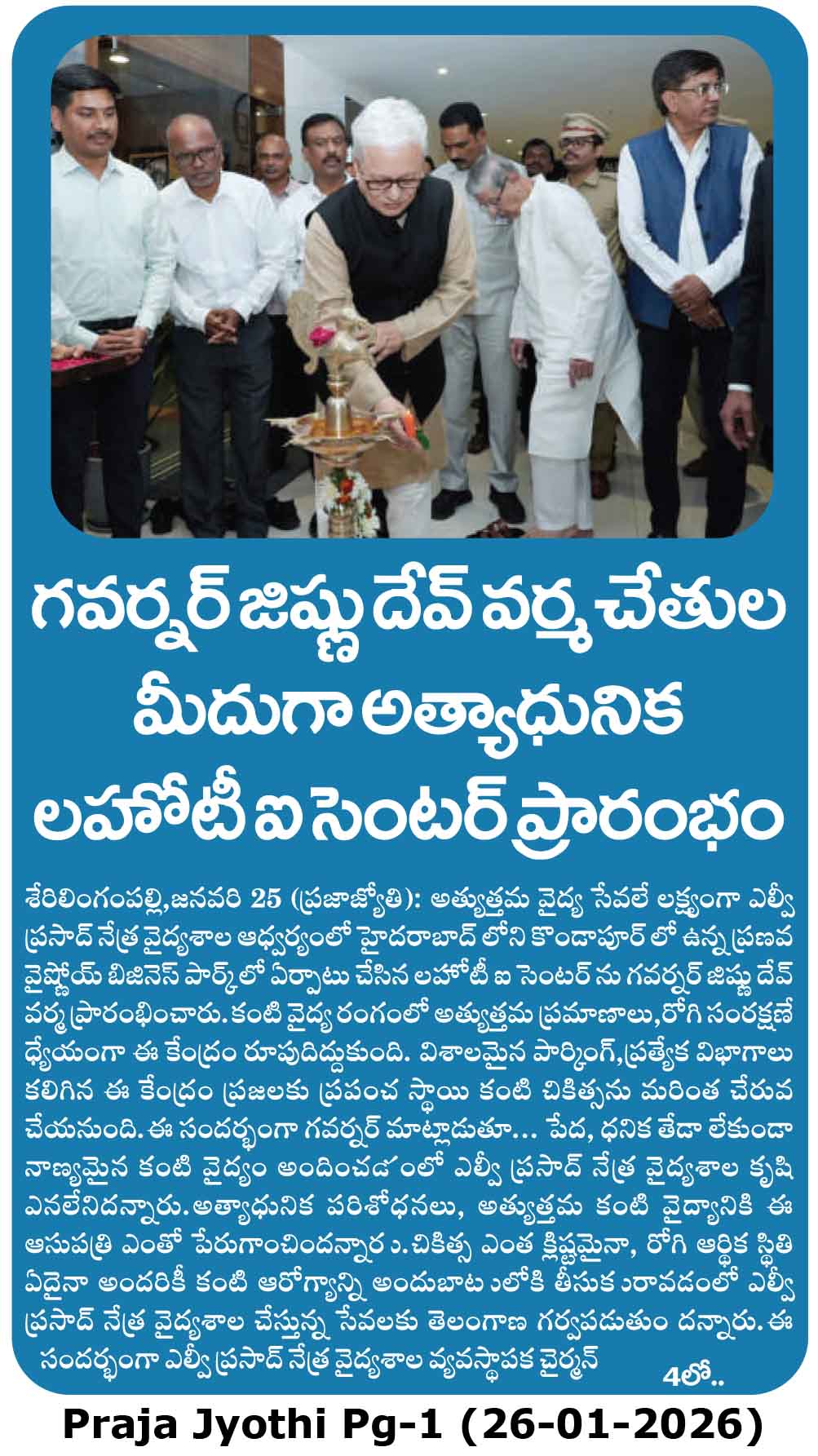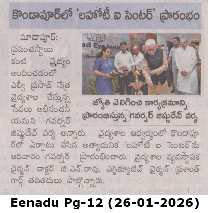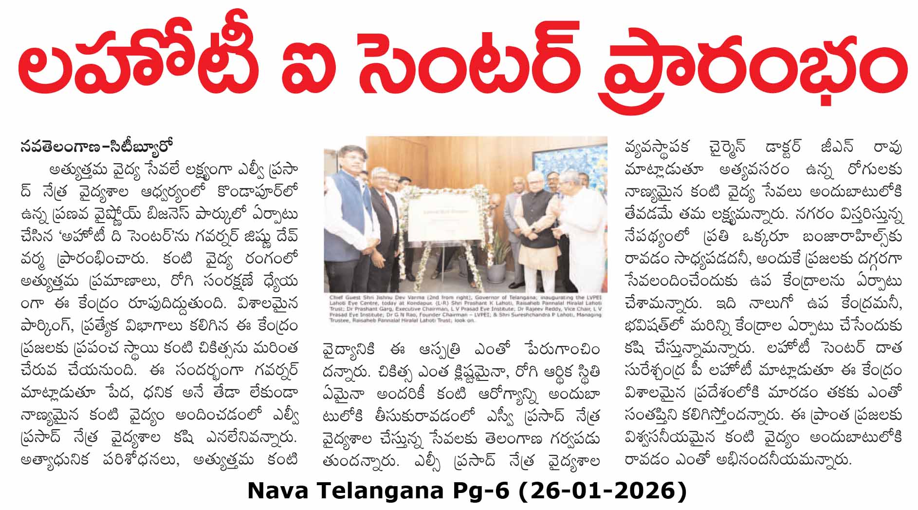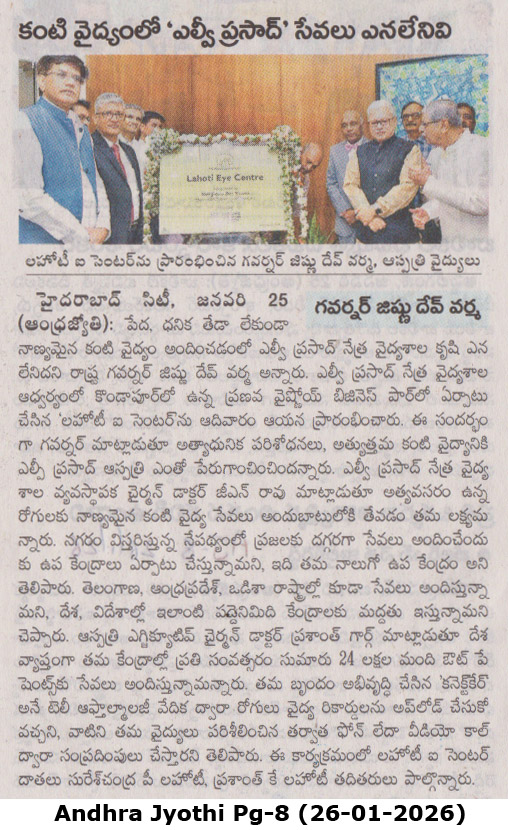- - https://matribhumisamachar.com/en/2026/01/26/shri-jishnu-dev-varma-honorable-governor-of-telangana-inaugurates-lvpeis-lahoti-eye-centre-at-kondapur/ - Matribhum Samachar