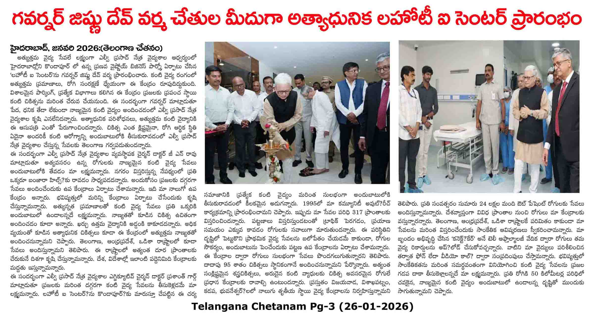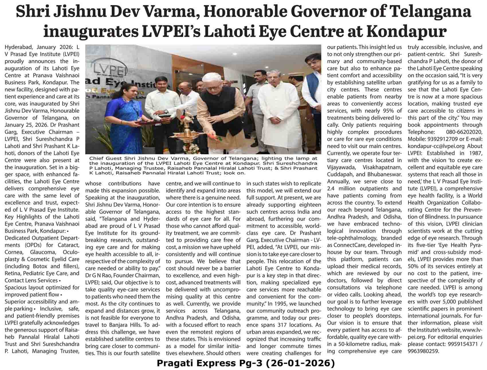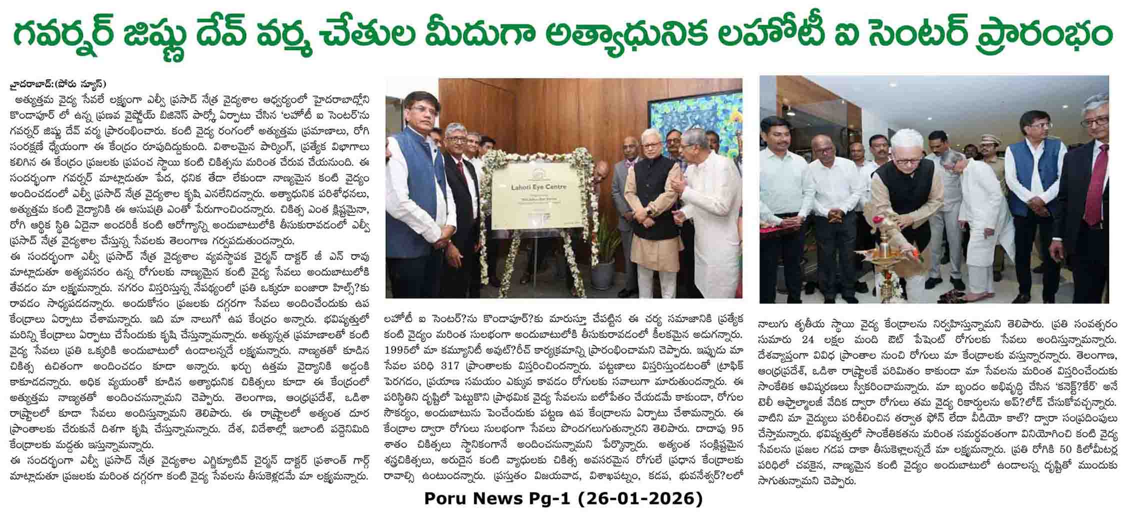 - - https://matribhumisamachar.com/en/2026/01/26/shri-jishnu-dev-varma-honorable-governor-of-telangana-inaugurates-lvpeis-lahoti-eye-centre-at-kondapur/ - Matribhum Samachar