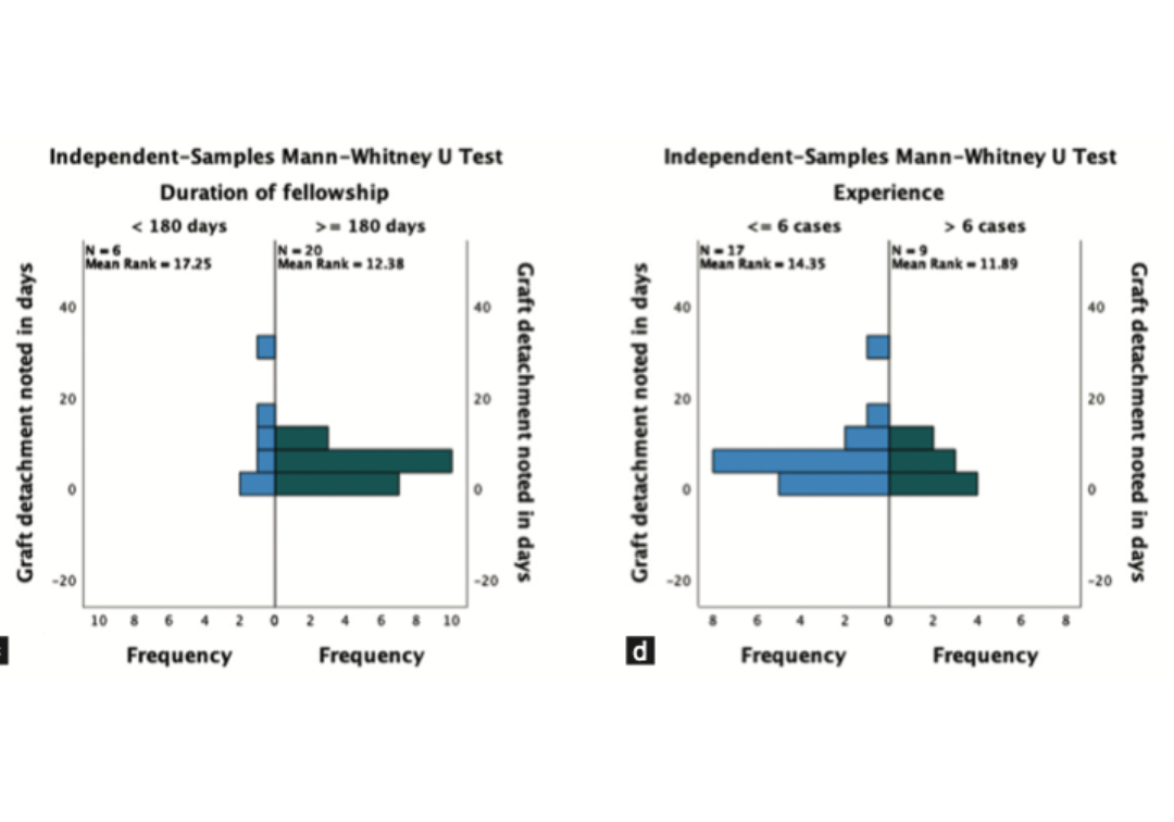 The study found that graft detachment occurred across all groups and was influenced by several factors, including case complexity and postoperative care. Fibrin formation—a sign of excessive handling—was seen only in surgeries performed by beginners. Although fellows in the late-training group showed good visual outcomes overall, the study revealed that the strongest predictor of better results was not time spent in training, but the actual number of DMEK surgeries performed. Fellows who had completed more than six surgeries consistently achieved better postoperative visual acuity than those with fewer cases, regardless of their fellowship duration.