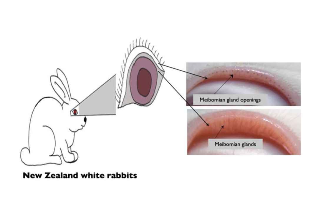 It is challenging to study MGD in humans and the affected tissue cannot be fully analysed while the patient is alive. This necessitates the need for animal models that can replicate the dysfunction in a research setting. Non-invasive and objective diagnostic assessments such as ‘non-invasive tear break-up time’ (NITBUT), Lipid layer thickness or meibography imaging are common tools to assess dry eyes in humans—but they are seldom used in animal models. Rabbits, with their large eyes and ocular surface, serve as a good model because they allow the use of imaging and diagnostic techniques similar to those used in humans.